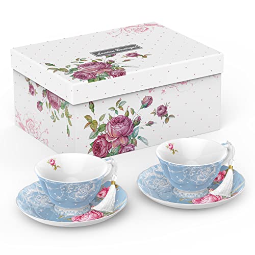 London Boutique Tea Cup and Saucer Set Afternoon Tea Set New Bone China Vintage Flora Rose Porcelain Gift Box(Rose Blue set 2)