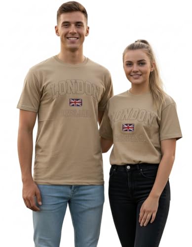 GWCC Unisex London England Applique Embroidery T-Shirt | Premium Cotton Tee with Union Jack Patch | 4 Colors | Sizes XS-4XL (UK, Alpha, XL, Regular, Regular, Desert Storm)