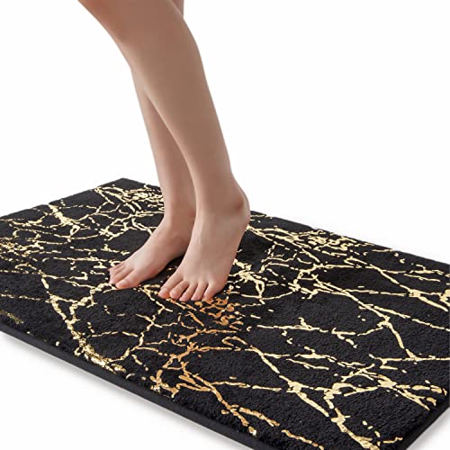 QJHOMO Black Long Bath Mat 60 x 120 cm Large Bathroom Mat Non Slip Bath Mats Gold Stripes Marble Rug Absorbent Microfiber Bathroom Rug Machine Washable Floor Carpet for Shower, Living Room, Bedroom