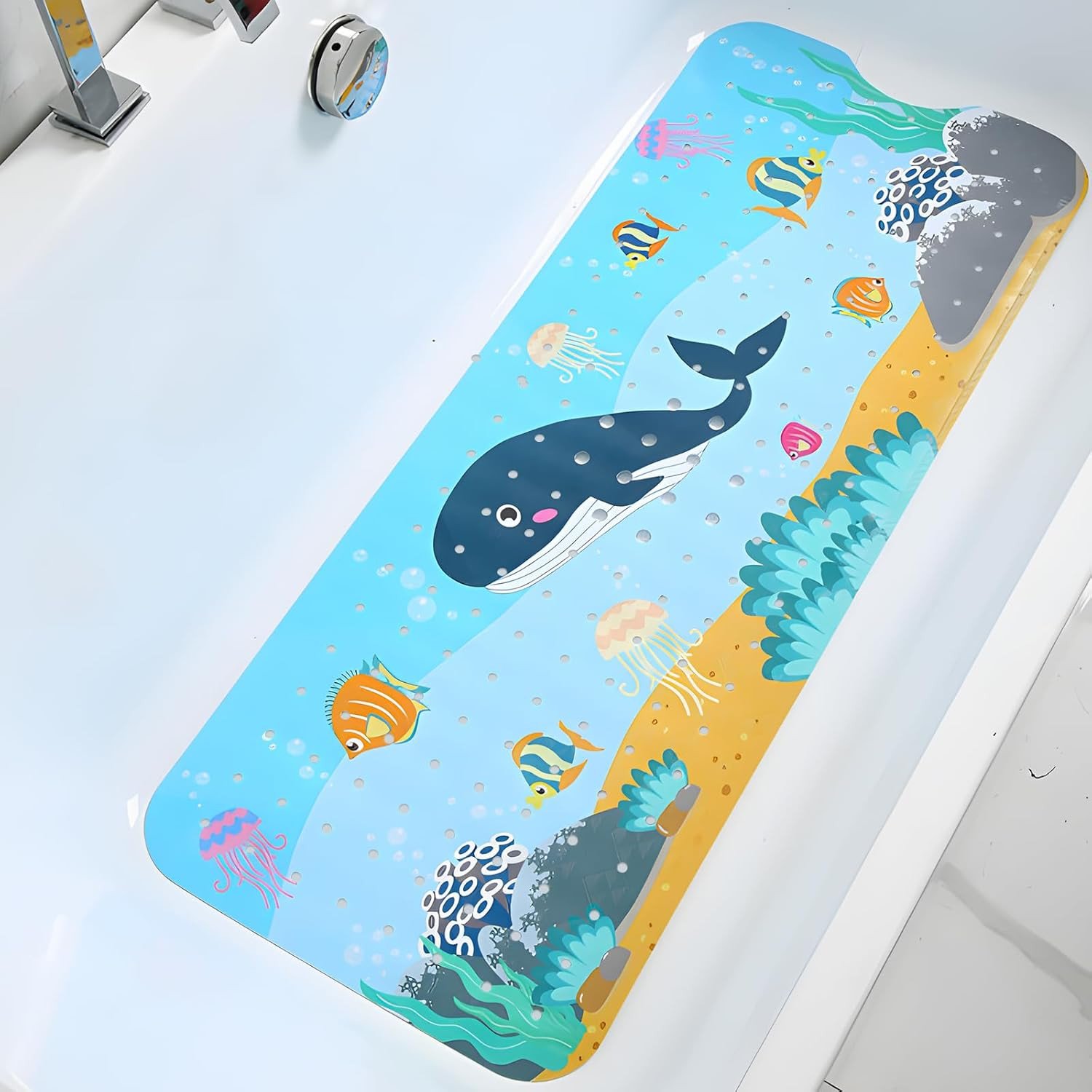 Baby Bath Mat Non Slip Anti Mould, Extra Long Bath Shower Tub Mat 100 x 40cm with Suction Cups and Drain Holes, Cartoon Patterned Kids Shower Mats, Machine Washable (Whale)