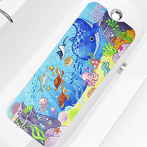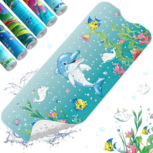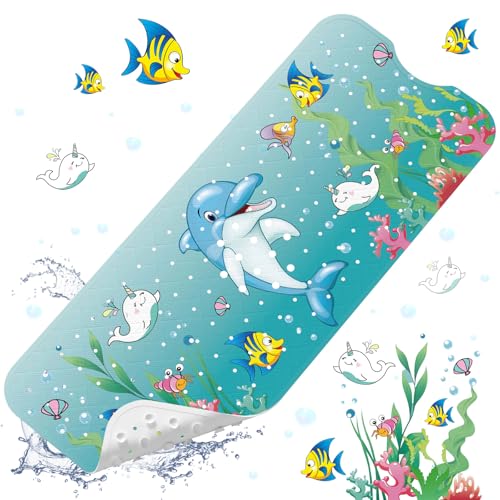 LATERN Bathtub Mat for Kid, 100CM x 40CM Extra Long Bath Tub Mat Anti Slip Shower Mat with Suction Cups and Drain Holes for Bathroom Wet Floor - Machine Washable (Dolphin)