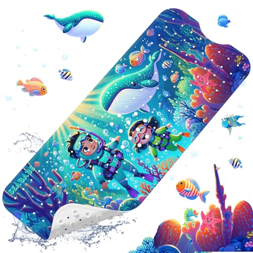 HITSLAM Baby Bath Mat Non Slip, Bathtub Mat Non Slip, 101 x 40cm Extra Long Bath Tub Mat for Kids, Bathroom Shower Mat with Suction Cups and Drain Holes, Soft on Feet, Machine Washable, Submarine