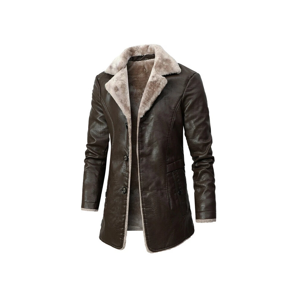 (Brown, UK XL) Faux Leather Fur Lined Long Coat Sheepskin Warm Winter Shearling Men's Jacket UK