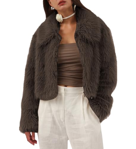 Nbzsmlkn Women's High Collar Fur Zipper Casual Jacket,Shaggy Warm Open Front Cardigan Coat Casual Long Sleeve Fluffy Outerwear,Women's Cropped Faux Fur Jacket (Brown,S)