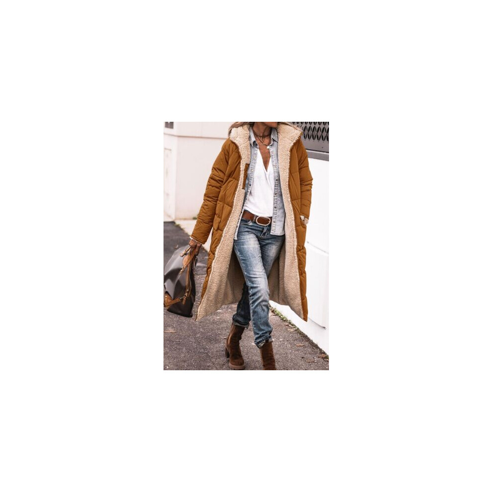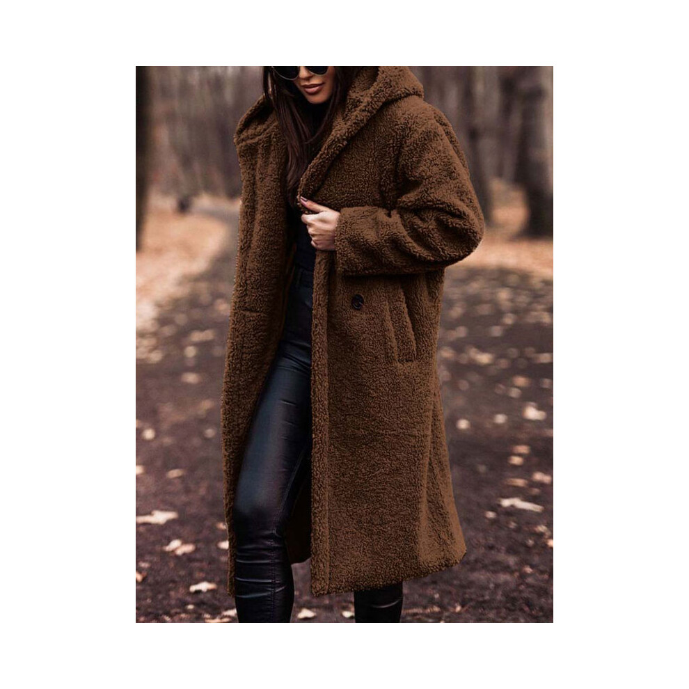 (Dark Brown, L) Women's Long Coat Fur Fleece Hooded Jacket Zip Up Winter Parka Coat Outwear 8-22