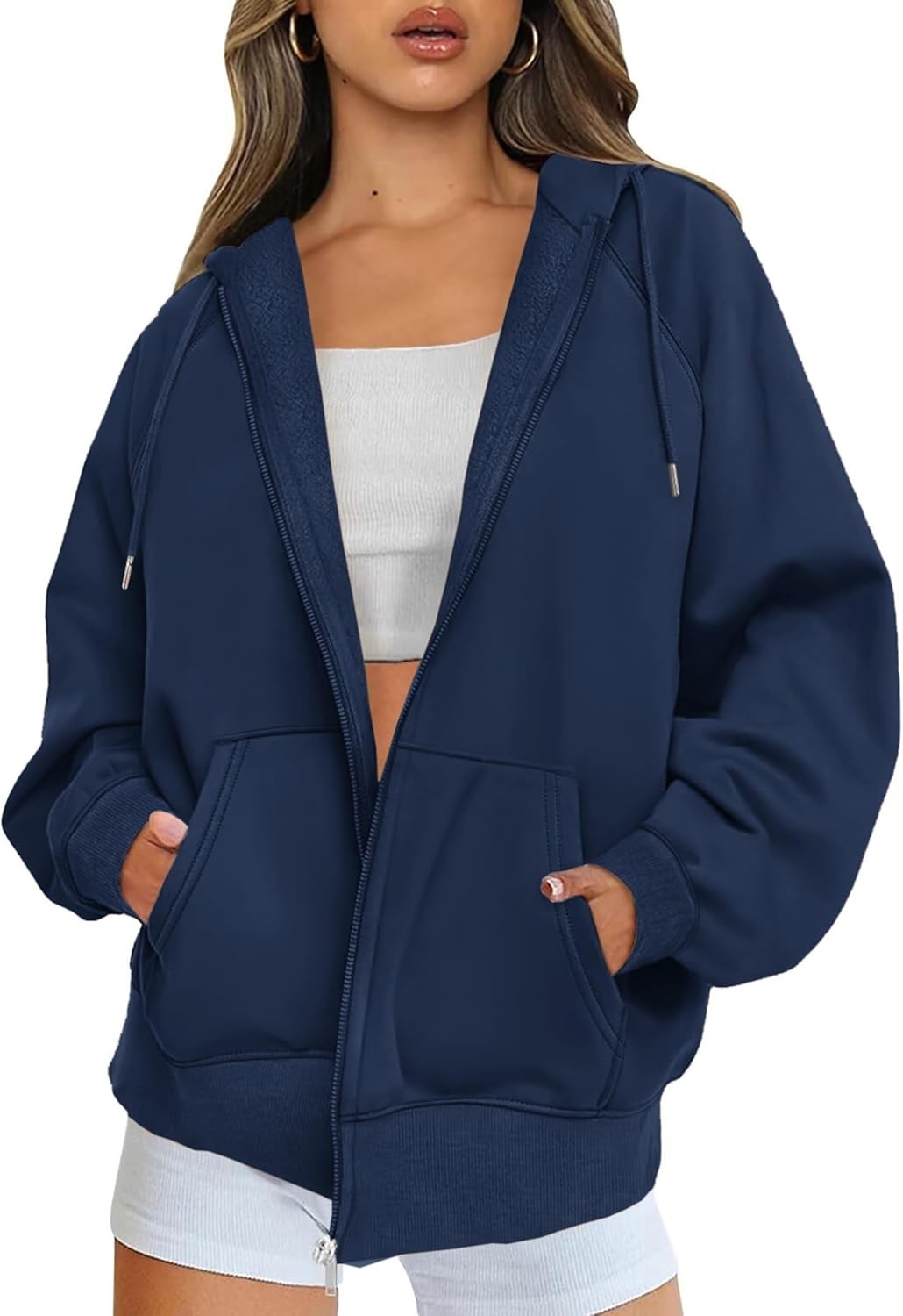 Jhsnjnr Womens Zip Up Hoodie Long Sleeve Fleece Jacket Coat with Pockets Drawstring Fall Oversized Sweatshirt Workout Navy Blue