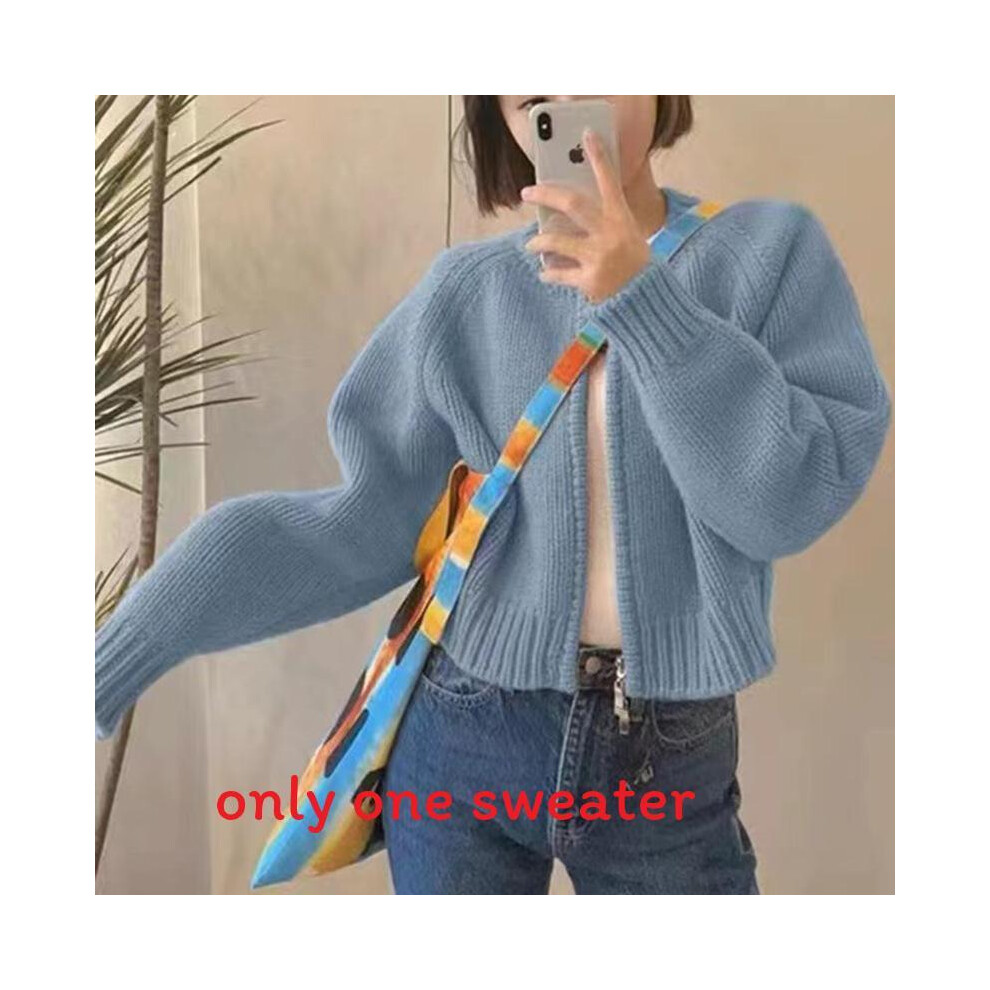 (Sky Blue) Long Sleeve Grey Cardigan With Zipper Knit Fabric Casual Sweater Wear For Winter