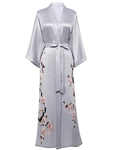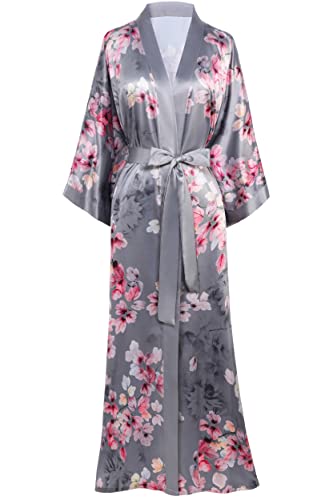 BABEYOND Kimono Dressing Gown Floral Printed Kimono Robe Long Satin Kimono Dress Cover Up for Women Wedding Pyjamas Party 135cm/53inches (Grey)