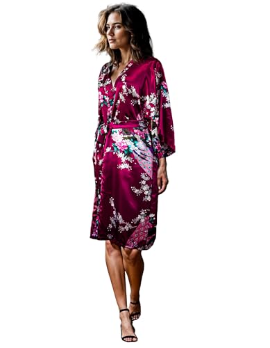 BABEYOND Satin Kimono Dressing Gown Short Floral Printed Kimono Robe Long Knee Length Kimono Dress Cover Up for Women Wedding Pyjamas Party (Green)