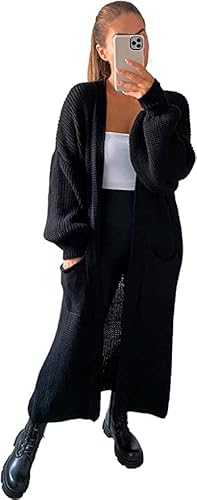 New Women Ladies Long Maxi Knitted Cardigan Balloon Sleeve 2 Pocket Open Front Boyfriend Cardigans Top (as8, Alpha, s, Regular, Regular, Black, One Size)