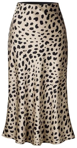 Raincol Womens Leopard Print Skirt Midi Long Length Silk Satin High Waist Elastic Skirts, Black, M