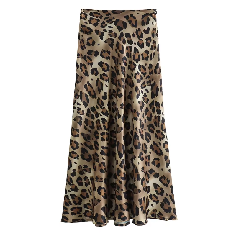 Autumn Leopard Print Women's Midi Skirt High Waist Vintage Satin Long Elegant Sk