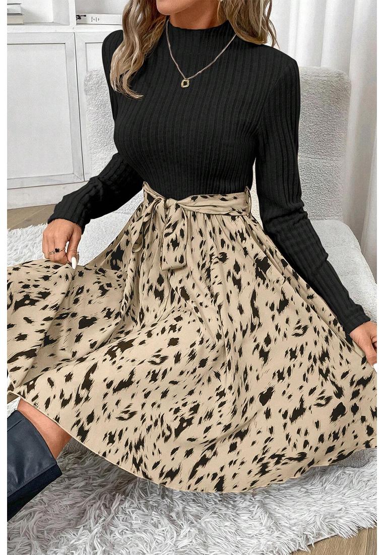 Azura Exchange Womens Ribbed Knit Long Sleeve Top with Leopard Print Skirt Casual Dress - Black - Size Large