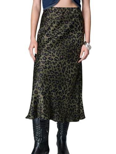 Women's Leopard Print Skirt Midi Long Length High Waist Ruffled Hem Midi Wrap Skirts Satin Casual A-line Skirt (A-Dark Green, M)