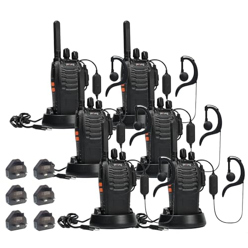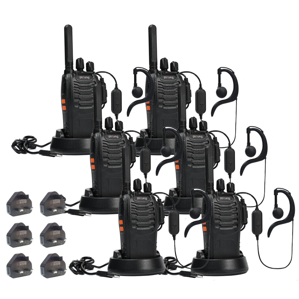 Walkie Talkie PMR446 License-free Handheld Two Way Radios pofung PT88E Professional Long Range Walkie Talkies for Adults with UK Charger Plug, Earpieces, VOX, Scan, 16 Channels, Light, Black, 6 Pack