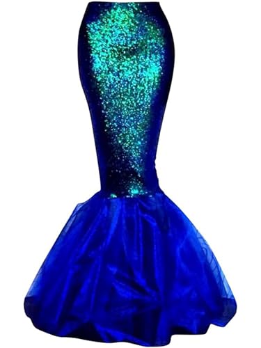 LYSINK Women Mermaid Long Tail Skirt Halloween Cosplay Fancy Costume High Waist Bodycon Sequin Maxi Skirt with Mesh Panel (Bd Blue, M)