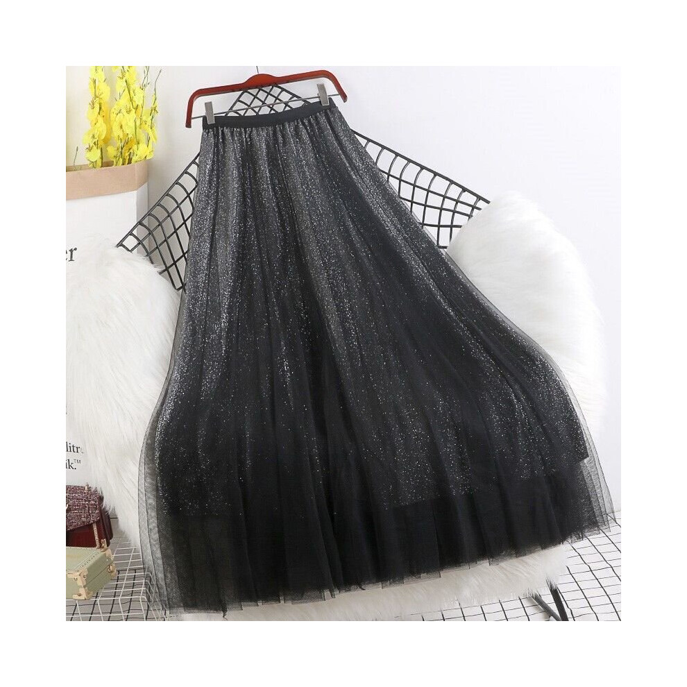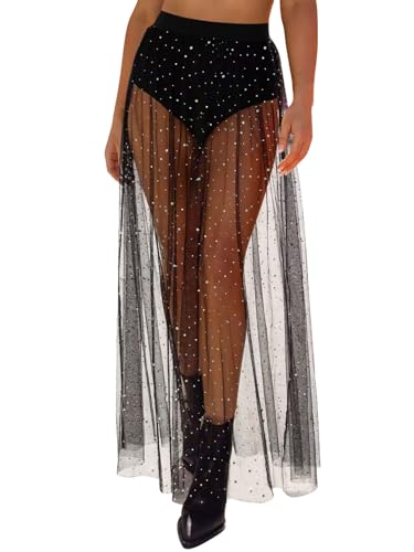 Eisnnu Women 2 in 1 Sheer Mesh Tulle Long Glitter Sequin Skirt Stretch High Waist A-Line Party Maxi Dress Streetwear Club Wear (UK, Alpha, S, Regular, Regular, Black)