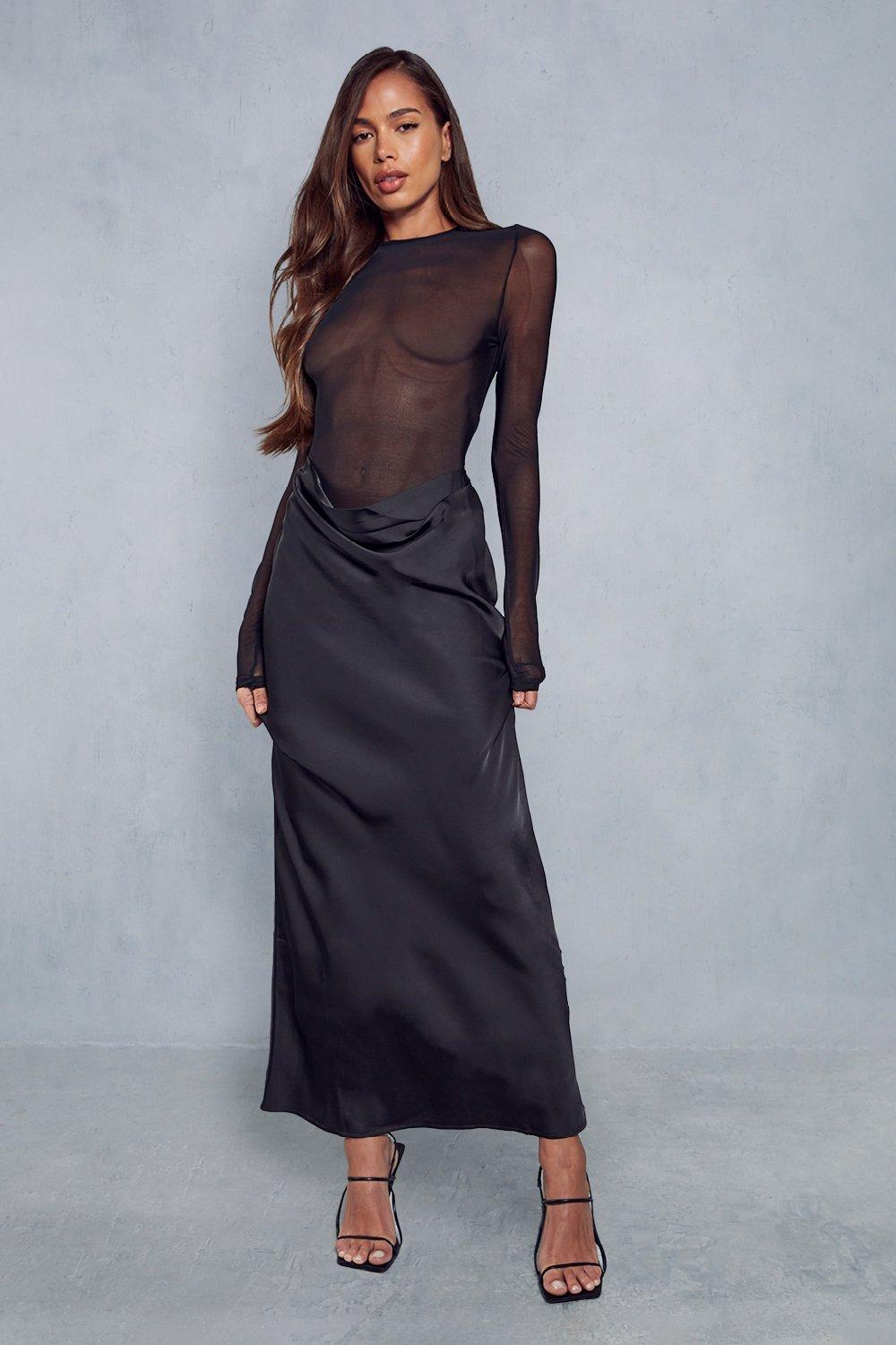 Mesh Body Satin Skirt Long Sleeve Maxi Dress