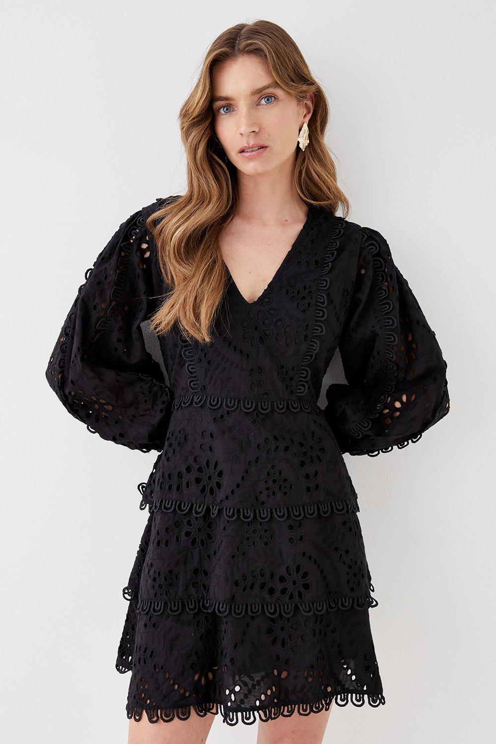 Broderie Long Sleeve Tiered Skirt Mini Dress