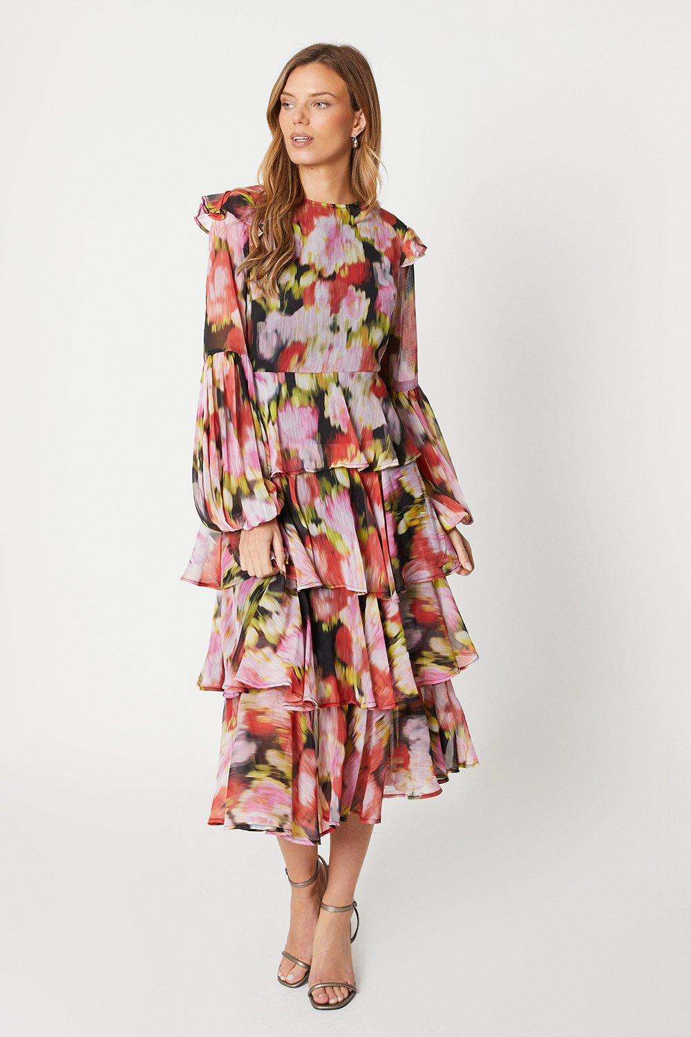 Printed Tiered Skirt Long Sleeve Midi Dress