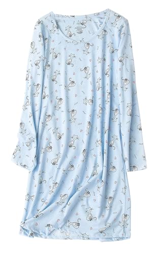 CHUNG Women Nightdress Ladies Nightie Long Sleeve Crew Neck Cotton Sleepwear Cute Pattern Print Loungwear Spring Summer BlueKitty XL