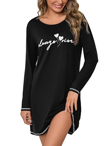 Bresdk Womens Nightwear Nightdresses for Women Cotton Nightie Long Sleeve Nightshirt Loose Fit Dressing Gowns for Ladies Black S