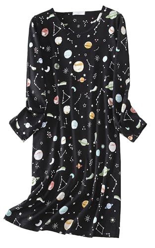 CHUNG Women Nightdress Ladies Nightie Long Sleeve Crew Neck Cotton Sleepwear Cute Pattern Print Loungwear Spring Summer Colorful Galaxy S