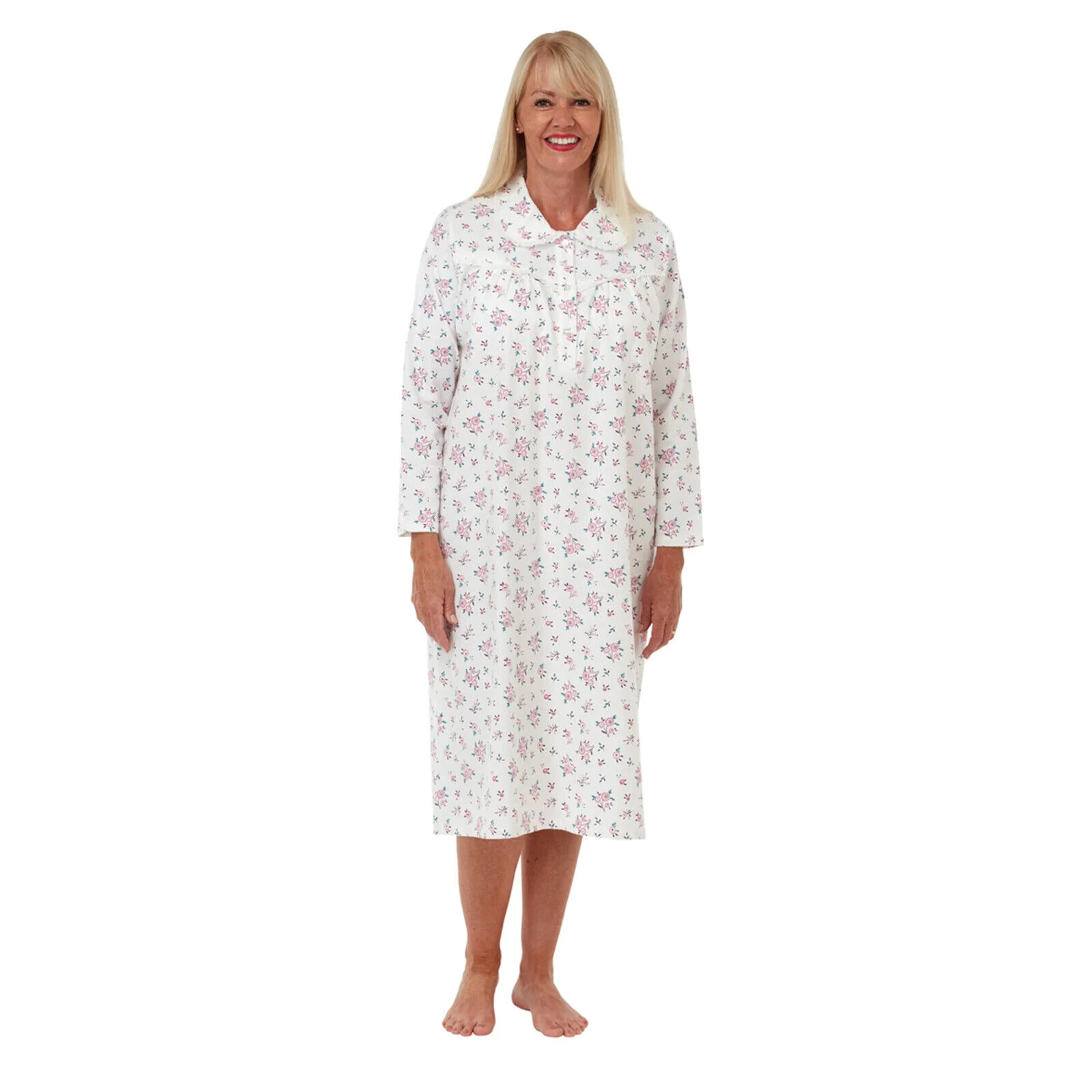 Ladies Print Frill Neck Nightdress Long Sleeve Button Front Cotton Nightie with