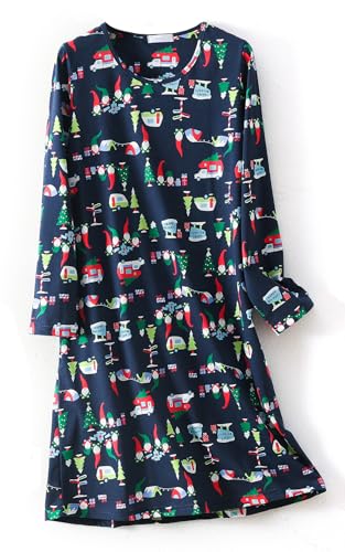 CHUNG Women Nightdress Ladies Nightie Long Sleeve Crew Neck Cotton Sleepwear Cute Pattern Print Loungwear Spring Summer Navy Xmas M