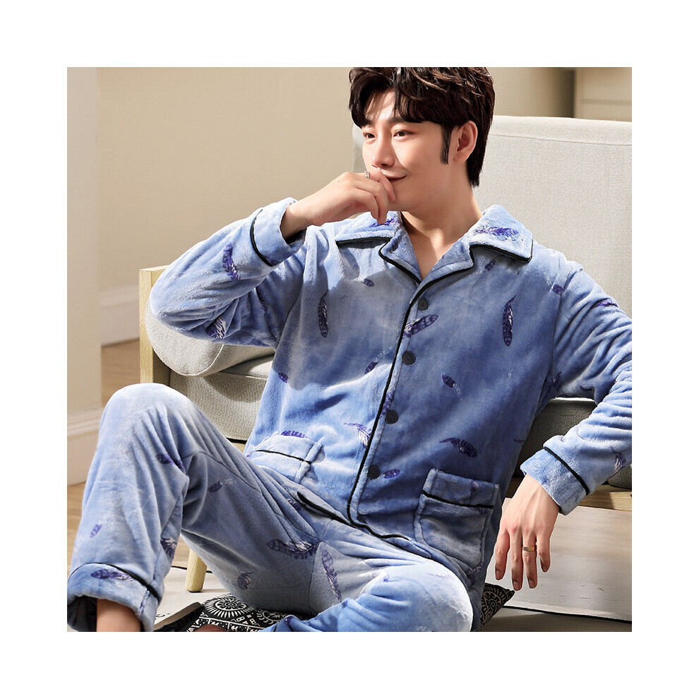 Men Pajama Sets Plus Velvet Thicker Long Sleeve Turn-down Collar Flannel Male Suits Winter Warm Homewear Nightie Home Clothes