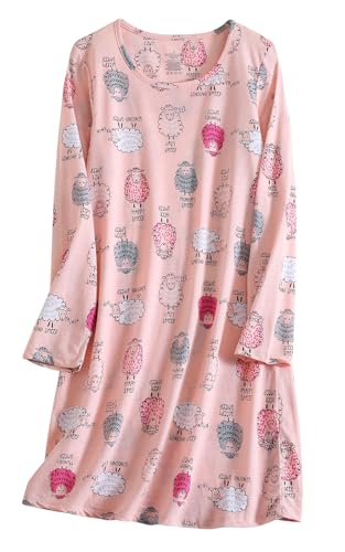 CHUNG Women Nightdress Ladies Nightie Long Sleeve Crew Neck Cotton Sleepwear Cute Pattern Print Loungwear Spring Summer PinkSheep S