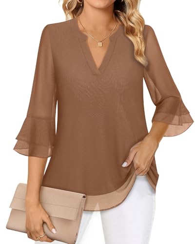 ACDAY Chiffon Blouses for Women UK Floaty Tops for Women UK Short Sleeve Tunic Top Ladies Elegant V Neck Going Out Tops Long Top to Wear with Leggings Black Coffee