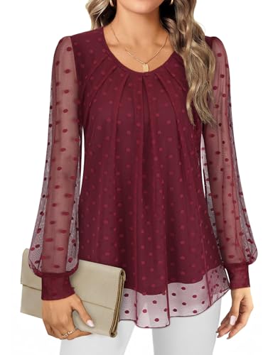 Gemulate Red Tops for Women UK Chiffon Top for Women UK Plus Size Long Sleeve Party Top Crew Neck Ladies Long Tops to Wear with Leggings - Wine Red, XXXL