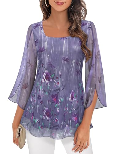 Syphiby Plus Size Tops, Blouses for Women Dressy 3/4 Sleeve Tunic Tops Double Layers Elastic Mesh Flowy Square Neck Chiffon Long Tops to Wear with Leggings