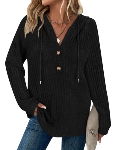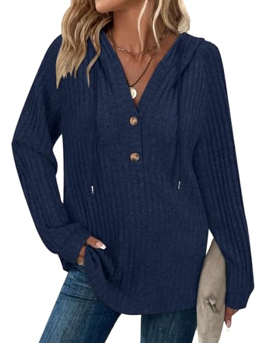 Ladies Hooded Jumpers Long Sleeve Tops for Women UK Button V Neck Jumper to wear with Leggings Casual Loose Solid Color Sweatshirt Hoodie Pullover Tops Dark Blue
