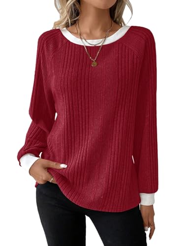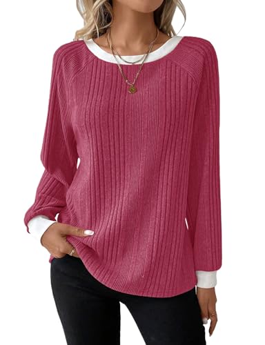 Akiooue Women's Jumpers,Ladies Long Sleeve T Shirt Womens Fall Colour-Block Round Neck Sweaters Women Long Tops to Wear with Leggings Rose Red