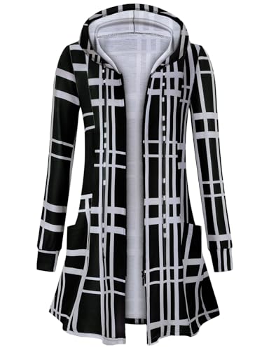 Flikity Hooded Cardigans for Women, Zipper up Knee Length Hooded Cardigan with Pockets Long Tunic Tops to Wear with Leggings Casual Office Work Blouses Lightweight Stylish Jacket Black and White XL