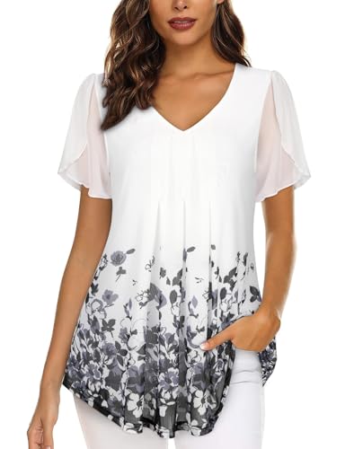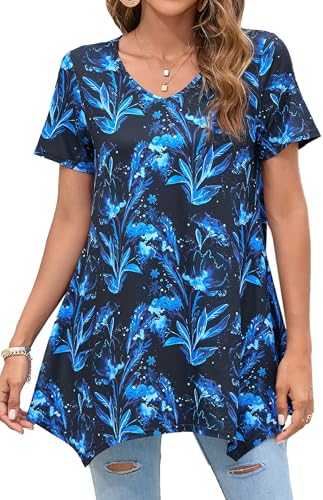ACDAY Ladies Blouses and Tops Dressy, Women Blouses Casual Short Sleeve Ladies Tops Elegant V Neck Tunic Shirt Summer Floral Pleated Mesh Layered Top Swing Long Shirts To Wear With Leggings Blue