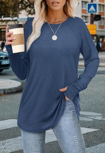 Womens Tunic Tops to Wear with Leggings Long Sleeve Thumb Hole Shirts Crew Neck Curved Hem, Blue, Large