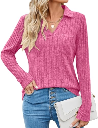 Gemulate Jumpers for Women UK Lightweight Sweatshirts Ladies Jumper Womens Polo Neck Jumpers Long Tops to Wear with Leggings -Hot Pink, L