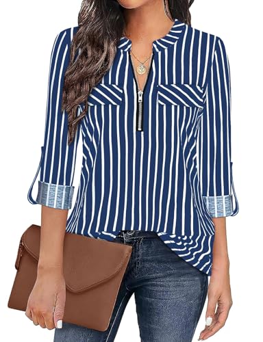 Gemulate Ladies Tops White Striped Shirt for Women Zip Up Plaid Tunic Blouse 3 Quarter Sleeve Shirt for Women Floral Printed Shirts Long Tops to Wear with Leggings - Dark Blue White Stripe, L