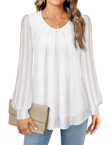 Gemulate Women's Top Chiffon Tops for Women UK Double Layer Ladies Top Long Sleeve Tops for Women Crew Neck Loose Fit Ladies Long Tops to Wear with Leggings Stripe White, M