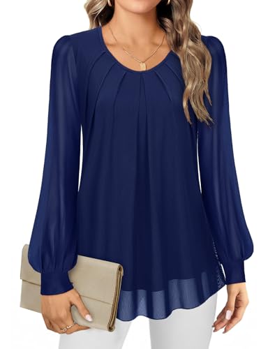Gemulate Chiffon Tops for Women UK Ladies Tops Evening Blouse for Women UK Long Sleeve Blue Sparkly Top Crew Neck Chiffon Tunic to Wear with Leggings Dark Blue, L