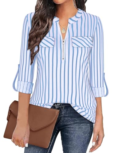 Gemulate Ladies Tops Blue Striped Shirt for Women Zip Up Plaid Tunic Blouse 3 Quarter Sleeve Shirt for Women Floral Printed Shirts Long Tops to Wear with Leggings - White Light Blue Stripe, L