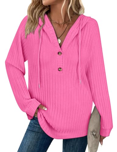 Syphiby Hoodies for Women UK Ladies Lightweight Jackets Long Sleeve Tops Cardigans Button V Neck Jumper to wear with Leggings Womens Work Clothes Hot Pink Hooded Pullover Top