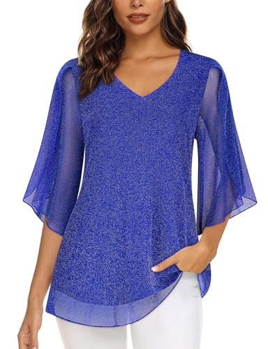 Gemulate Ladies Evening Tops Evening Sparkly Top Long Tops for Women Uk Chiffon Tops for Women Uk Long Tops To Wear with Leggings Party Tops for Women Uk Blue Chiffon Tops for Women Sparkly Blue, M