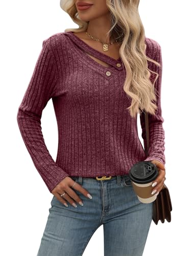 Flikity V Neck Jumpers for Women UK, Womens Long Sleeve Tops Knitted Tunic Blouses Tops to Wear with Leggings Elegant Ribbed Jumpers Ladies Lightweight Sweaters L