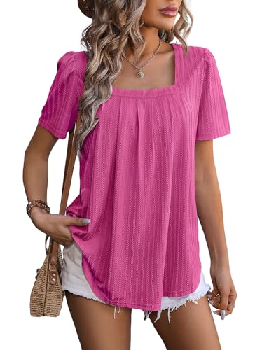 Flikity Going Out Tops for Women UK, Casual Square Neck Top Short Sleeve Blouses Ladies Summer Tops Womens Long Tunics to Wear with Leggings Party Top Flowy T Shirts S Rose Red