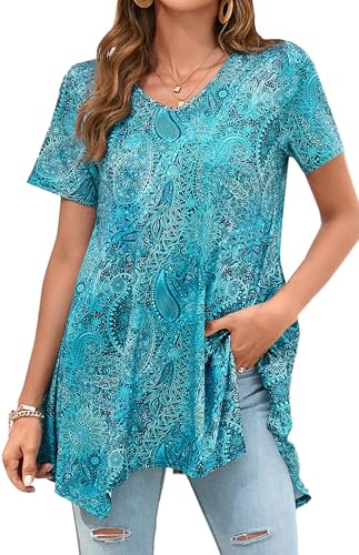 Enmain Tunic Tops for Women Short Sleeve Ladies Long Tunics Summer Casual Longline Baggy Top to Wear for Leggings Older Ladies Tshirt Teal,3XL