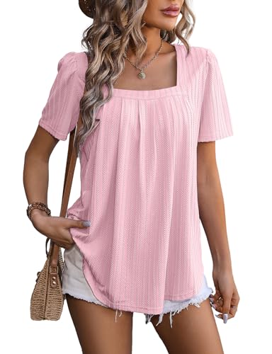 Flikity Square Neck Tops for Women, Ladies Short Sleeve Tops Blouses for Women Casual Office Work Wear Long Top to Wear with Leggings Floaty Top Womens Summer Shirts Pink L